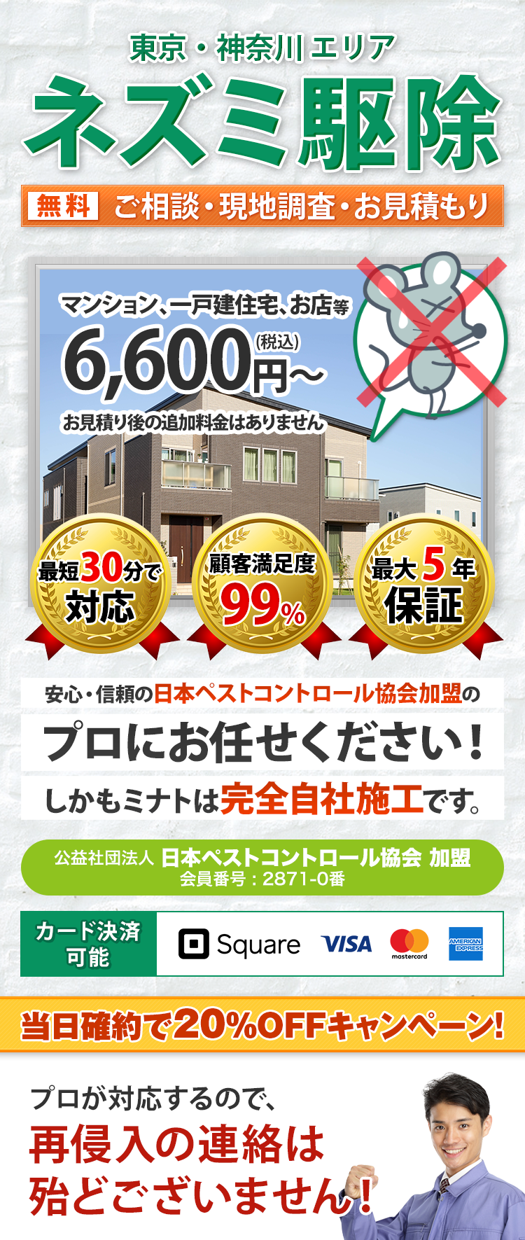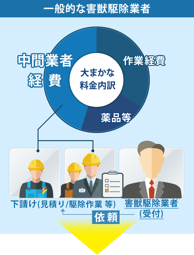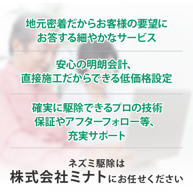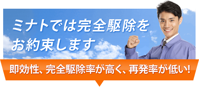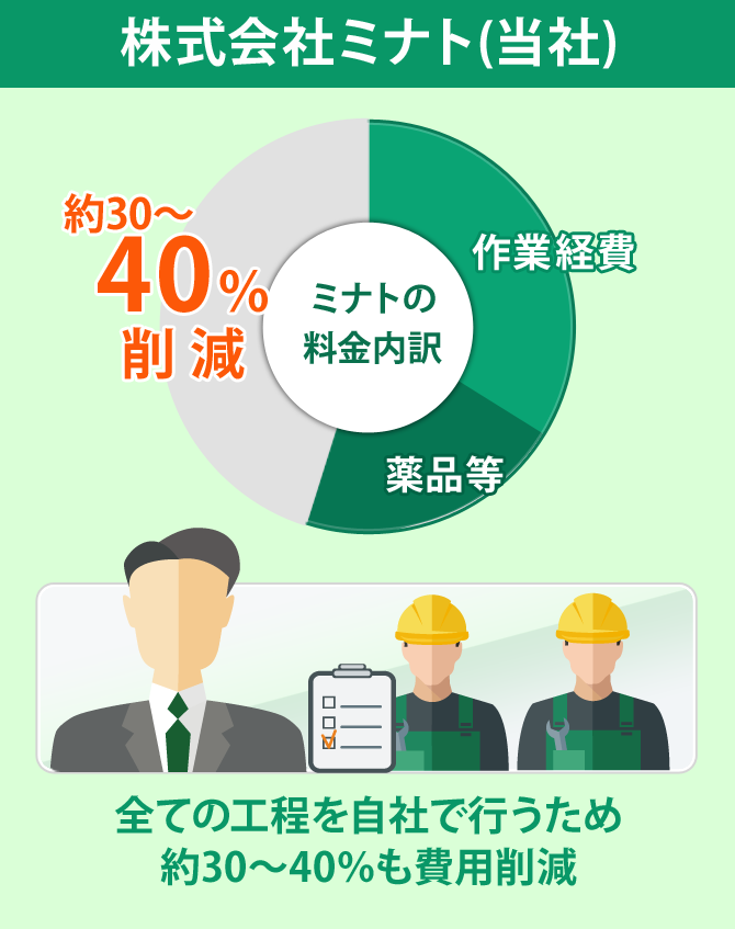 一般的にHP上で全国対応を謳っている駆除業者は下請けに出し施工金額の30%~40%を紹介手数料として徴収します。ミナトは自社集客、自社施工を徹底しておりますのでその分を価格面でお客様に還元させていただいております。