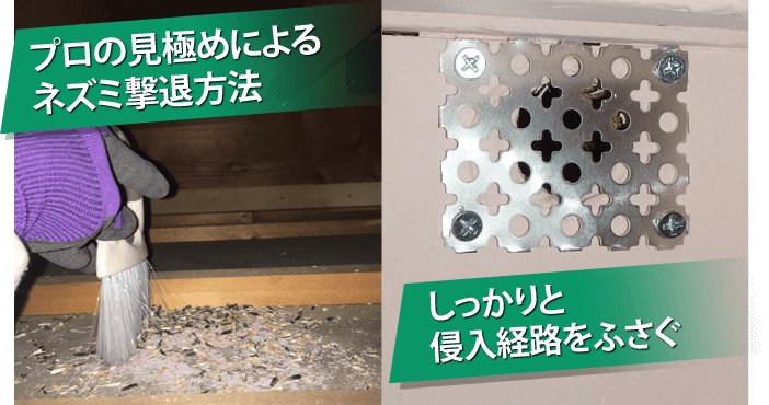 トラップや忌避剤でネズミの行動範囲を狭め、毒エサで建物の外へ追い出し侵入経路を塞ぐ。