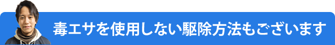 小さいお子様がいらっしゃる、またはペットを飼っているご家庭では毒エサの使用を控える場合がございます。毒エサを使用しない駆除方法もございますのでご心配の方はぜひご相談ください。