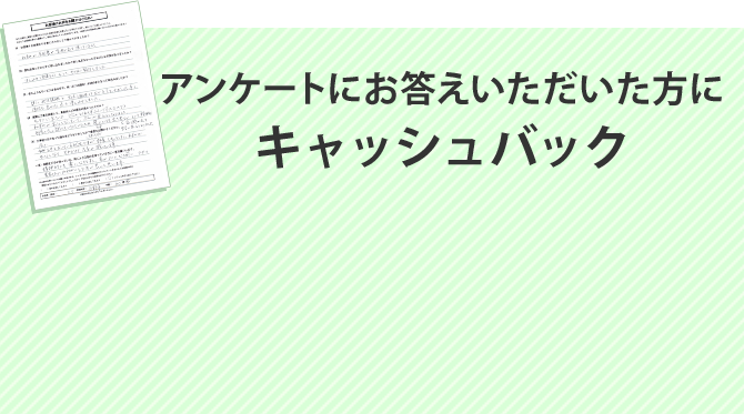 今後のサービス品質向上のためアンケートにお答えいただいたお客様にキャッシュバックを行っております。詳しくは担当までお問い合わせください。